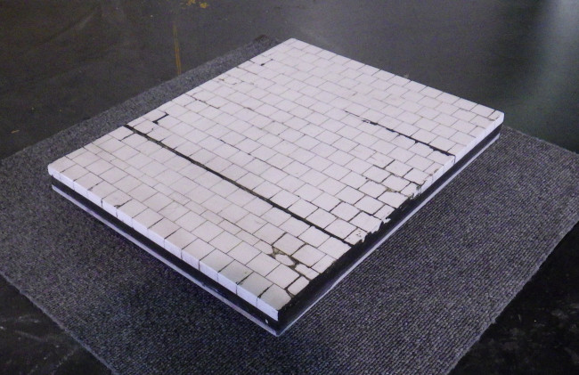 セラミックチップを一枚一枚丁寧に貼り付けていく施工の様子です。当社のベテラン職人が、設備の形状や用途に合わせて最適な施工を行います。現地での出張施工にも対応しておりますので、移動が難しい大型設備にもご対応可能です。